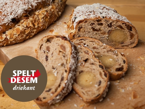 De kerststol: gebakken met uitsluitend speltmeel en speltbloem heeft een rijke vulling van zuidvruchten en noten, verse appel, sinaasappel en met zuivere amandelspijs.